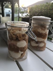 3. Varva i glas. Börja med kakbitarna/smulorna och fortsätt med ostkrämen och sedan rabarberkompotten o.s.v. Avsluta med kaksmulor.