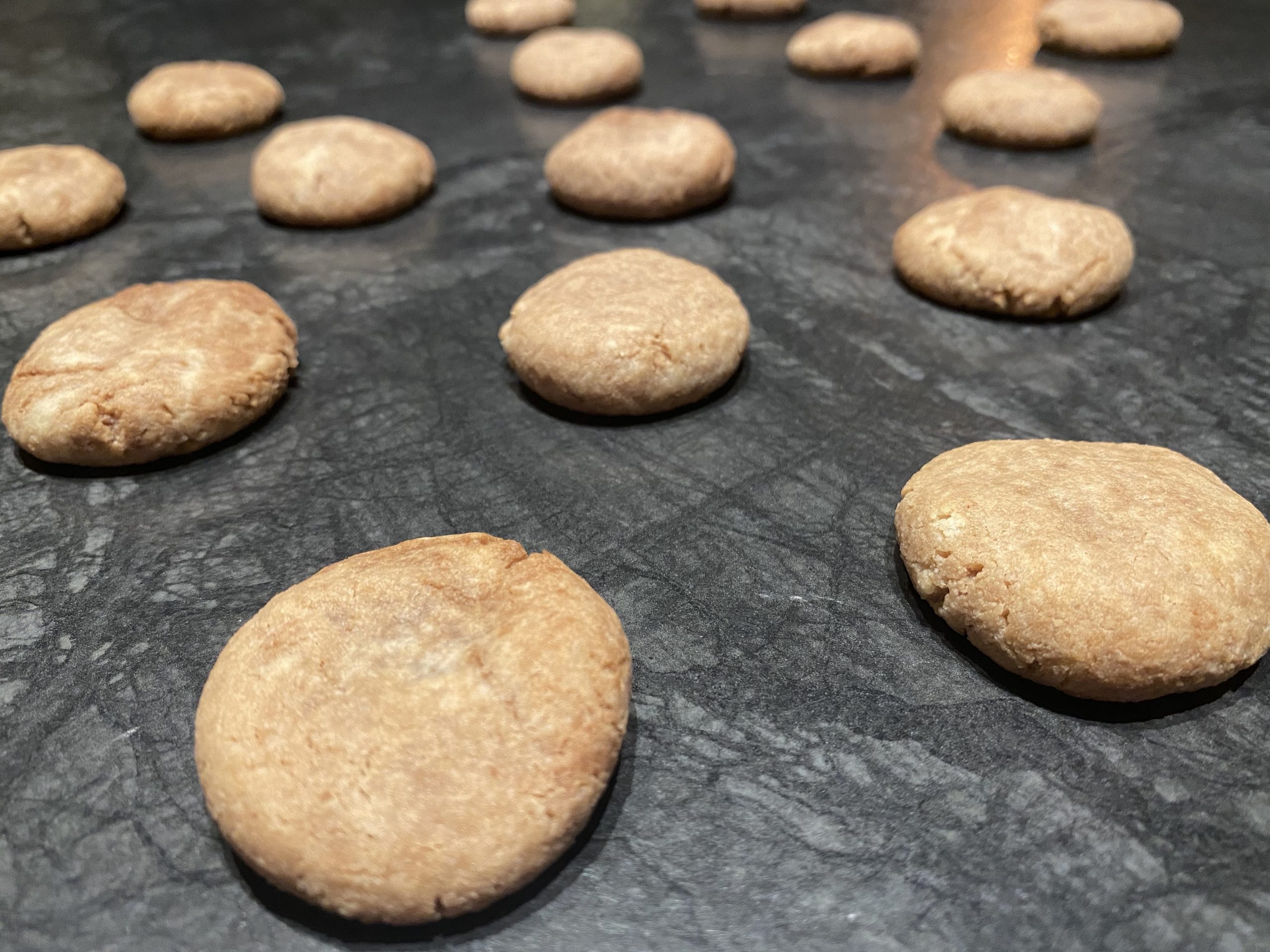 - Forma till 16 st små bollar, lägg dem på bakplåtspappersklädd plåt och tryck till dem så de bli lite platta. Grädda i 175 grader i mitten av ugnen i ca 10 minuter. Låt svalna.